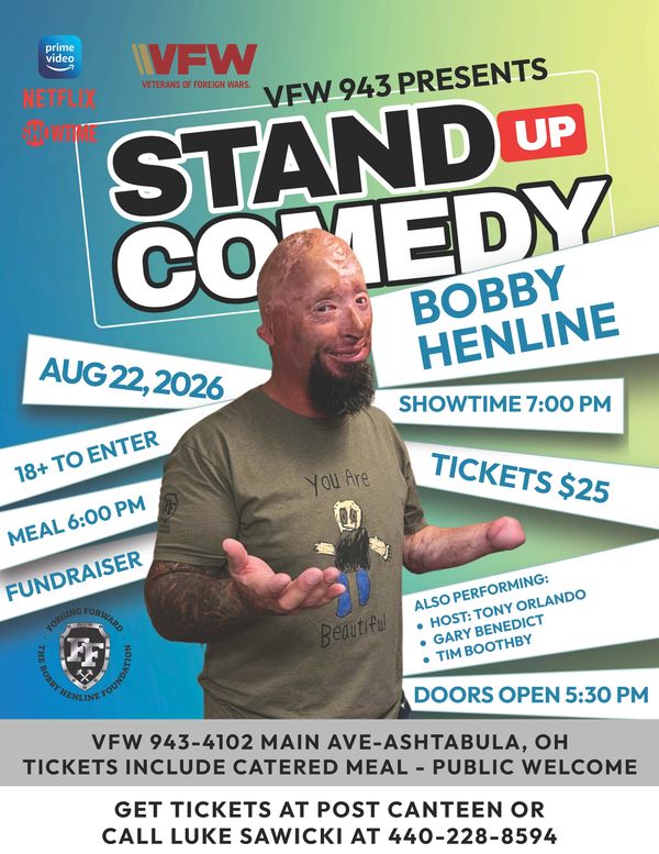 VFW 943 presents Stand Up Comedy with Bobby Henline, featuring Gary Benedict and Tim Boothby, and host Tony Orlando.